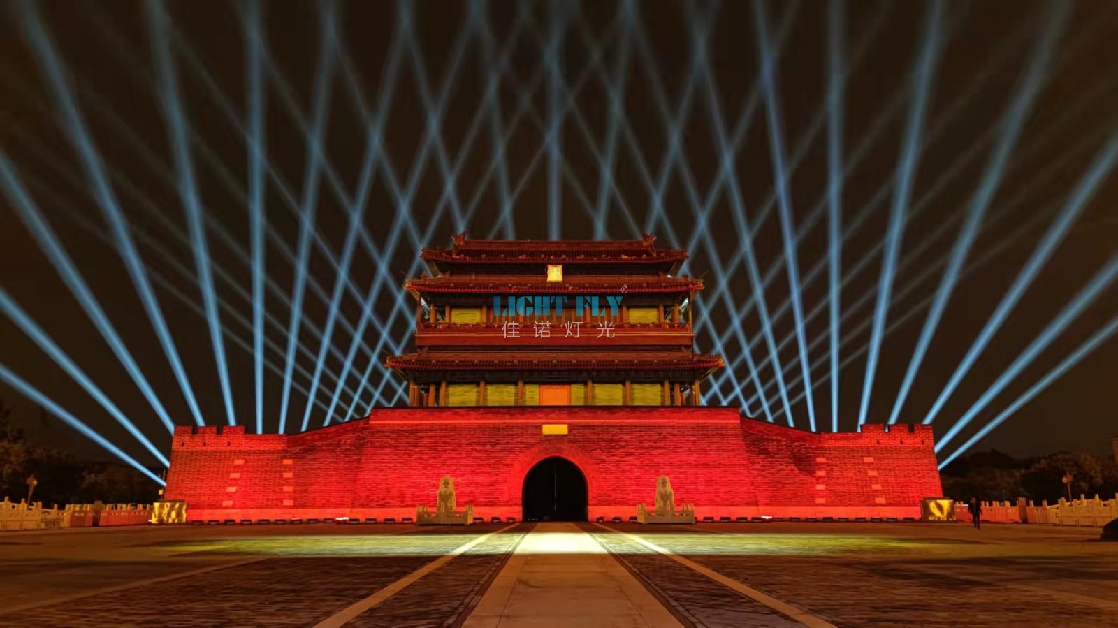 為了吸引全國各地客戶來商丘旅游,佳諾燈光LIHGT FLY設(shè)計部為商丘古鎮(zhèn)設(shè)計了最新震撼的古鎮(zhèn)燈光秀,古鎮(zhèn)外圍設(shè)計了100臺44X10W防水LED投光燈給古鎮(zhèn)墻體外圍鋪光染色效果,60臺防水480W光束燈放在墻上上面,實現(xiàn)夢幻光束七彩效果,在配備了四臺60W全彩防水動畫激光燈實現(xiàn)地標(biāo)激光效果,吸引五公里范圍的游客眼光,通過BEYOND雕刻軟件與投影實現(xiàn)古鎮(zhèn)雕刻與投影激光效果,得到了游客紛紛留念拍照。