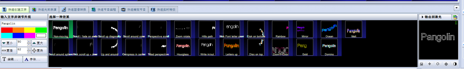 不過,Quickshow卻絕非如此簡單。其強(qiáng)大之處在于內(nèi)置了多個(gè)快速創(chuàng)建新內(nèi)容工具,讓你按需創(chuàng)建自定義節(jié)目。比如你可以把現(xiàn)有的位圖快速轉(zhuǎn)換為激光能用的圖案,非常容易地制作光束等。而"快速創(chuàng)建文字"工具(見下圖)則可以讓你快速制作多種文字效果,比如滾動(dòng)文字、波形文字等。你還可以為文字選擇字體、顏色和各種。