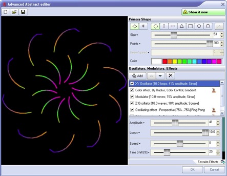 "Abstract"模塊可以讓你添加多層調(diào)節(jié)器、振蕩器、顏色循環(huán)以及其他各種波形線條效果。層疊數(shù)目無限制,讓你可以做出令人驚嘆的迷幻效果!這是其他軟件很難甚至無法做到的!