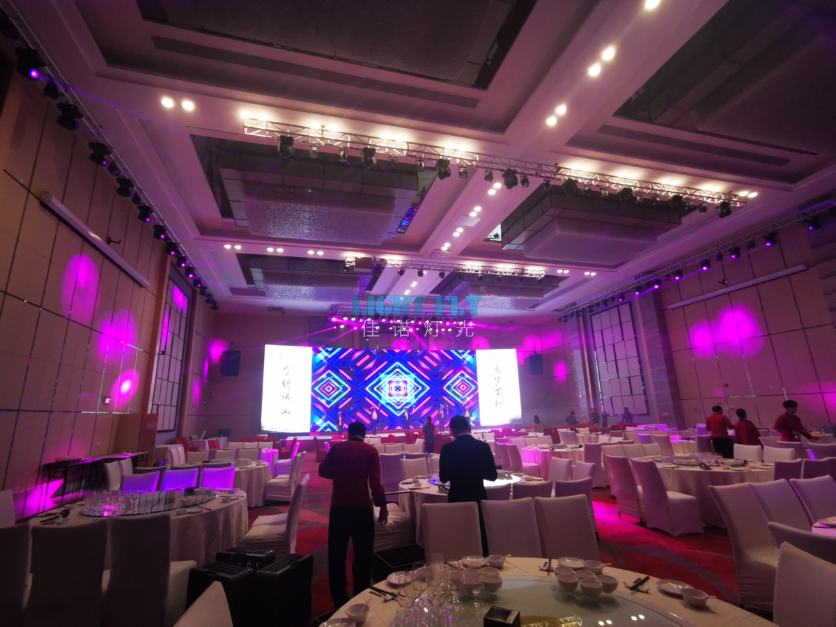 千燈湖酒店宴會(huì)廳整個(gè)大廳高度達(dá)到10米,佳諾燈光LIGHT FLY為酒店宴會(huì)廳主要設(shè)計(jì)左右兩道側(cè)光:光束燈+LED帕燈各20臺(tái)鋪光左右兩邊。主舞臺(tái)設(shè)計(jì)了三道頂光+一道面光:380W光束圖案燈+LED染色帕燈,LED面光采用最新的4X50W四眼LED面光燈,舞臺(tái)后面還配備了一臺(tái)30W全彩動(dòng)畫(huà)激光燈打造美輪美奐的激光秀,絢麗的燈光秀得到了酒店領(lǐng)導(dǎo)的一致滿(mǎn)意。