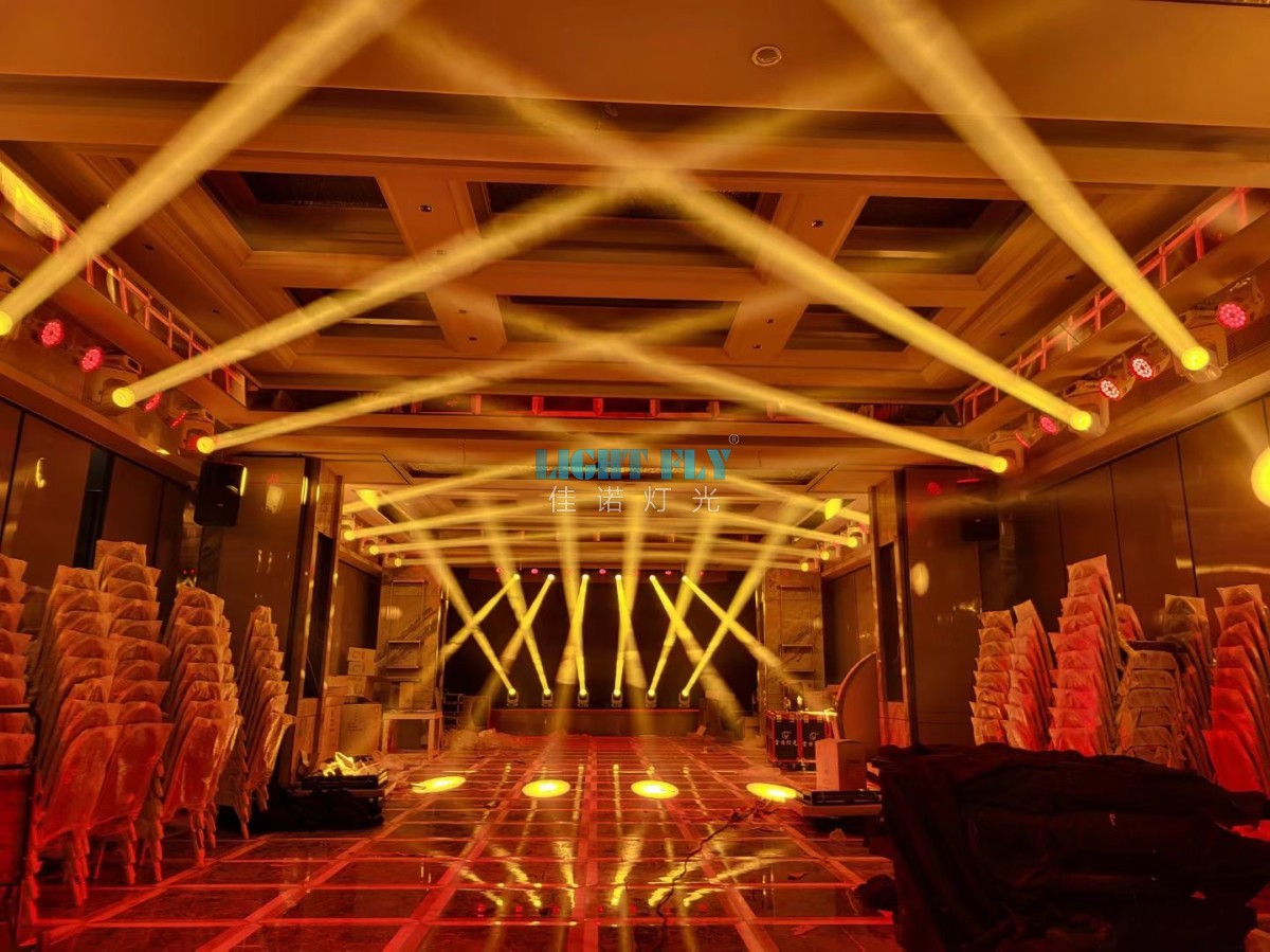 廣成大酒店2022年迎來5個(gè)宴會(huì)廳燈光重新裝修與設(shè)計(jì)。整個(gè)酒店宴會(huì)廳整體裝修高檔典雅、時(shí)尚華貴,將“崆峒文化”和“廣成文化”的厚重、包容與現(xiàn)代化大都市的開放、科學(xué)有機(jī)結(jié)合。酒店共設(shè)六大功能區(qū)域:大堂接待區(qū)寬敞大氣,大堂吧配有緩流水景、精品玉器店、名優(yōu)特產(chǎn)專賣店、廣成畫廊,滿足不同賓客的購(gòu)物休閑需求。舞臺(tái)與大廳設(shè)計(jì)全部由佳諾燈光LIGHT FLY設(shè)計(jì)師完成。采用了酒店宴會(huì)廳常用的380W光束與18顆10W四合一LED染色帕燈,四眼LED面光燈,薄霧油煙霧機(jī),燈光控制臺(tái)燈等舞臺(tái)燈設(shè)備。符合了現(xiàn)代化宴會(huì)廳燈光秀效果。